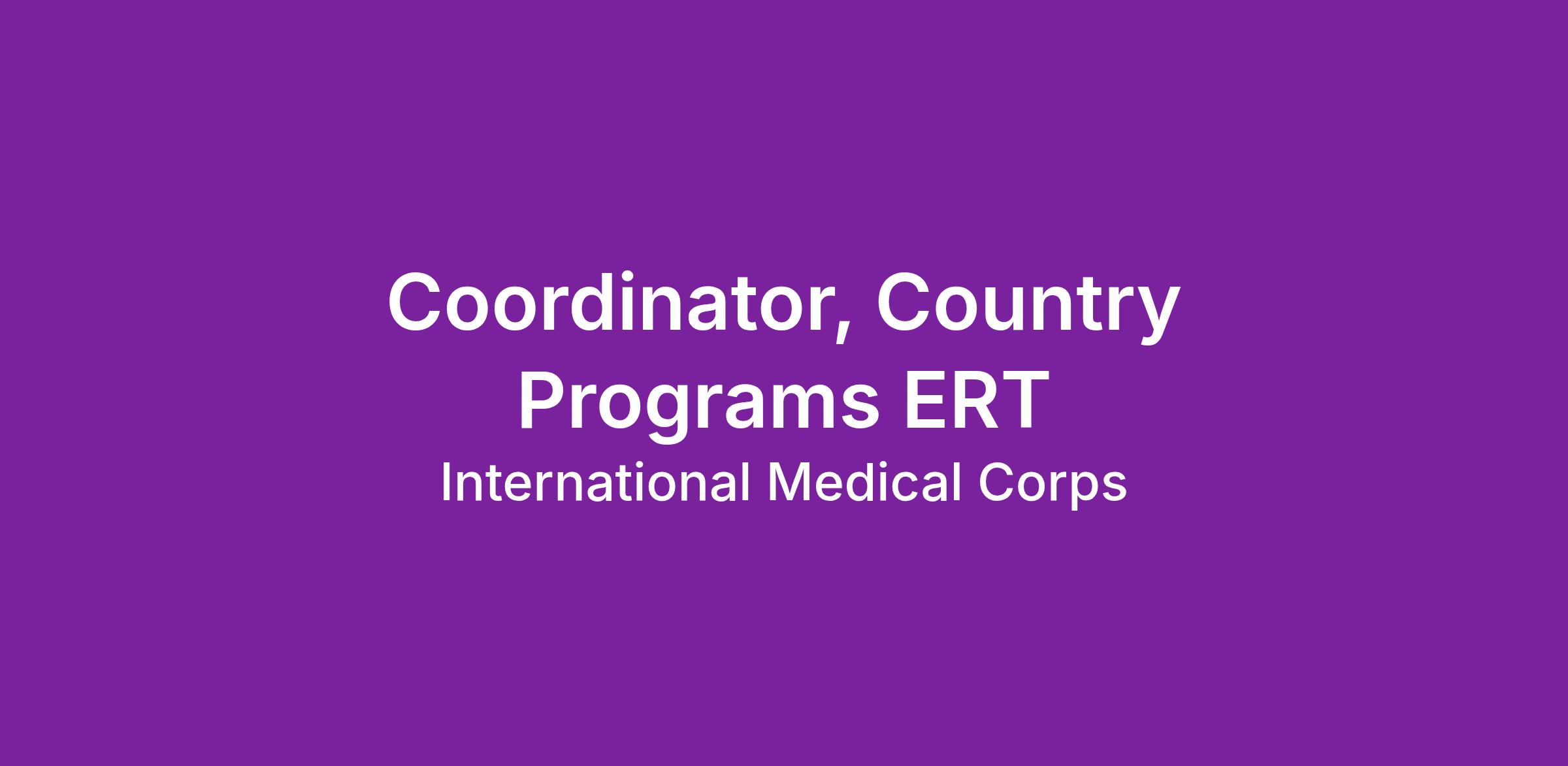 JOB SUMMARY: The primary responsibility of the Country Programs Coordinator ERT is to support the implementation of services in an emergency setting. The Country Programs Coordinator ERT conducts and supports assessments, coordinates start up activities, develops proposals including budgets, logical frameworks, and detailed work plans. The Country Programs Coordinator ERT represents International Medical Corps at UN Cluster meetings, liaises with local authorities and members of affected communities, and collaborates with humanitarian actors. S/he supports the Emergency Response Team Leader when needed.