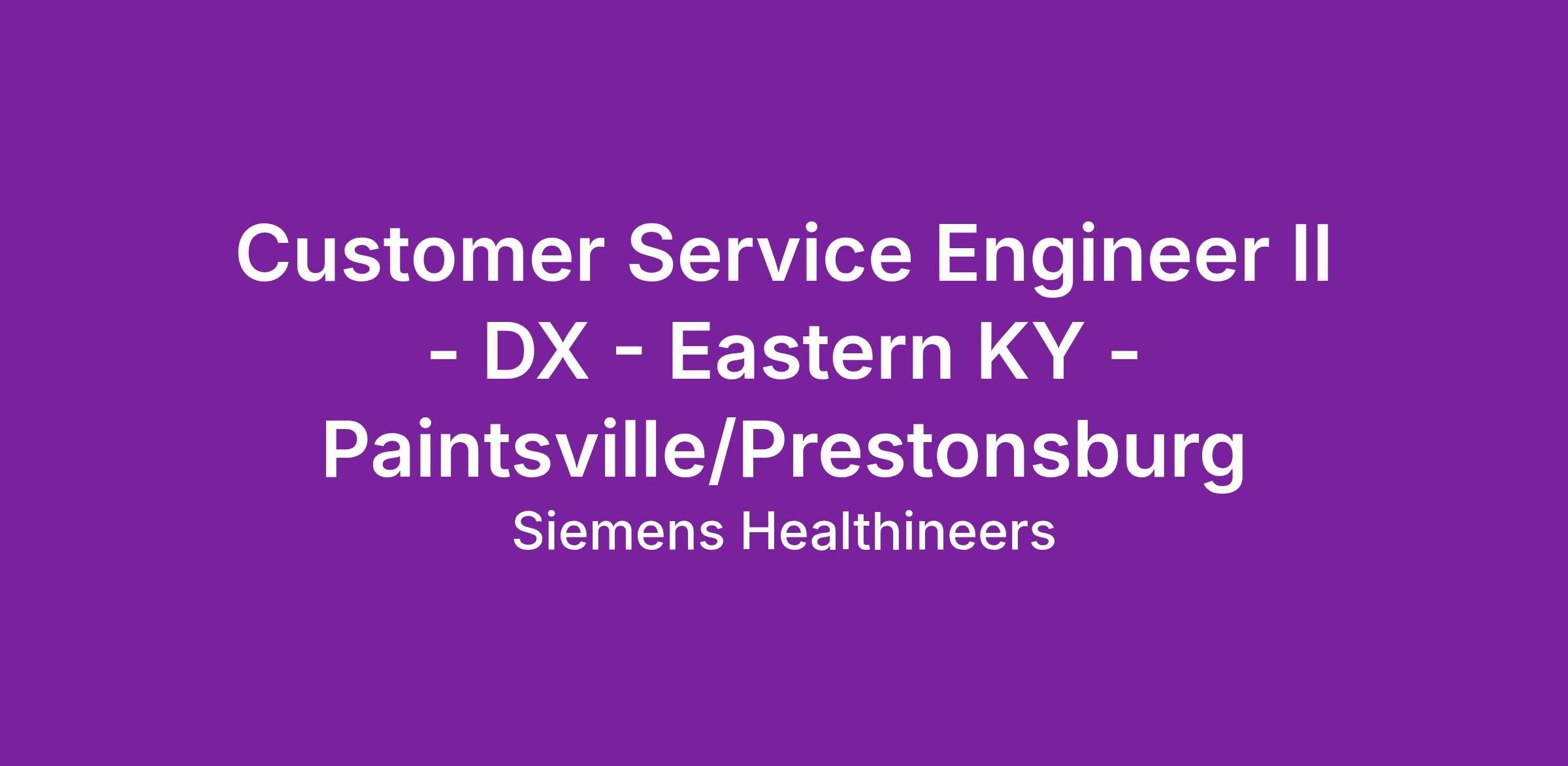 You will be servicing Diagnostic Equipment in the Eastern, KY - Paintsville/Prestonsburg area. Customer Service Engineer Level based on prior experience.