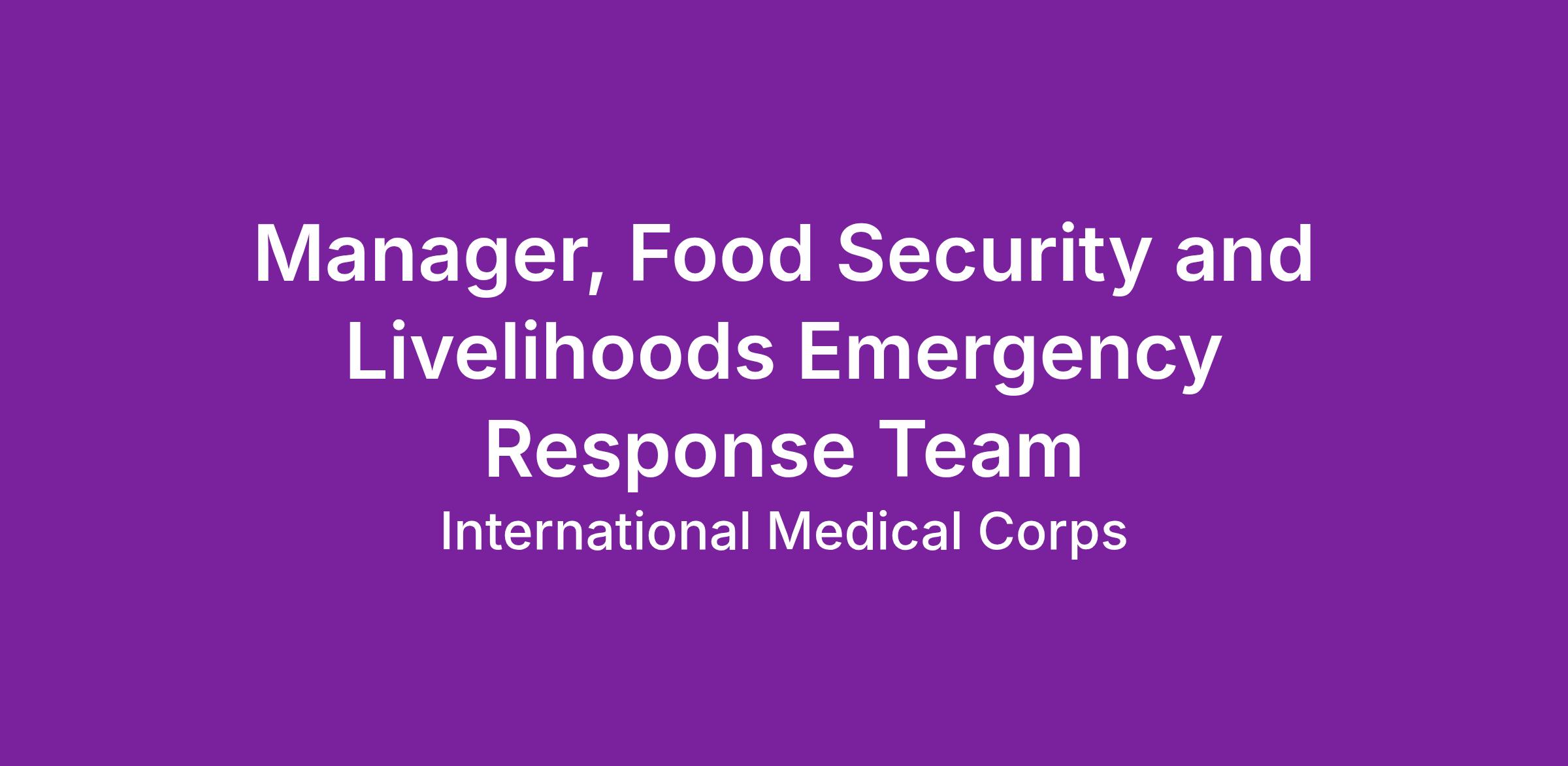 JOB SUMMARY: The primary responsibility of the Emergency Food Security and Livelihoods Manager is to: support the Emergency Response Management team and FSL Advisor in the planning and implementation of emergency food security, cash transfers, restocking, seeds, and other food assistance activities as well as contribute to the livelihood's recovery of the disaster-affected populations. S/he will conduct the rapid FSL and multi-sectoral assessments, recruit, supervise, guide, and advise field officers in the selection, registration, and verification of beneficiaries as well as implementation of emergency FSL activities. S/he will draft Situational Reports and contribute to the overall response by International Medical Corps to the crisis. S/he will liaise with partners and communities to ensure the timely provision of food security and livelihood assistance and will be deployed as part of an initial team following the onset of a disaster.