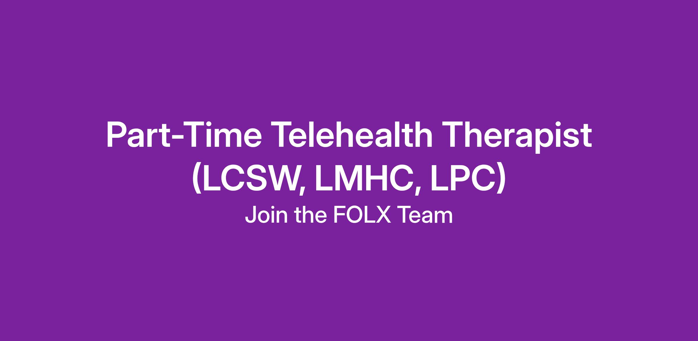 We are currently seeking Part-Time Telehealth Therapists (LCSW, LMHC, LPC) to join our FOLX Behavioral Health Services! As a therapist with FOLX, you will be providing individual therapy to our members (patients) through a telehealth platform.
