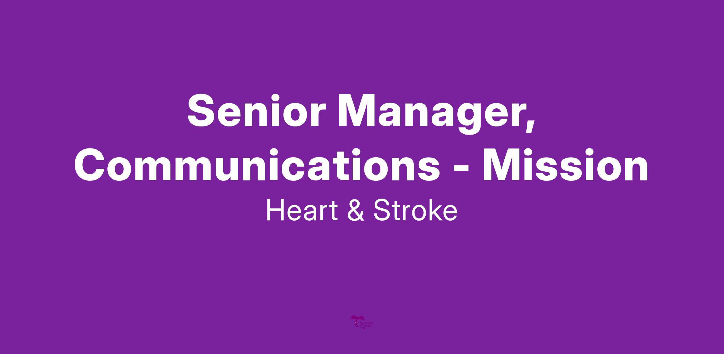 Senior Manager, Communications - Mission is expected to understand Heart & Stroke’s mission work across the country including mission priorities and strategic plans, to help anticipate, plan for and implement communication solutions that maximize support for mission, fundraising, development and other teams. This role contributes to mission storytelling across the organization and is a key partner in the development of integrated marketing and fundraising campaigns and other mission work that reaches mass audiences as well as key decision makers (eg health systems leaders, politicians etc).